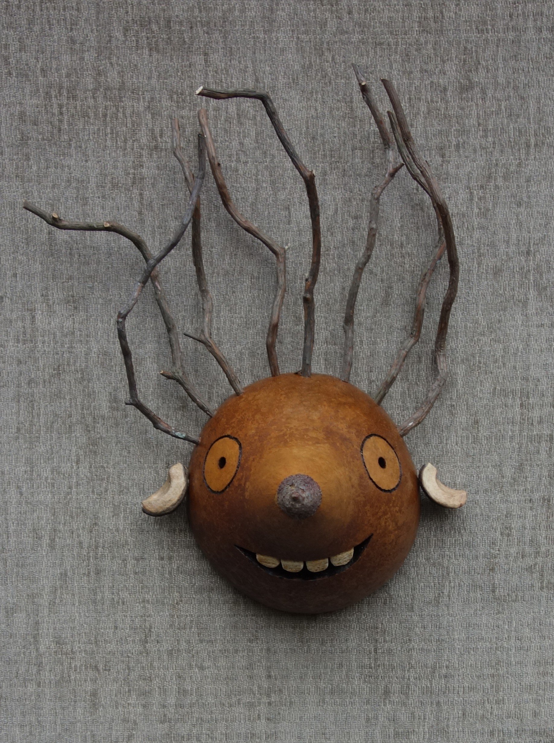 Trail Spirit Masks are made from traditional and found materials: gourds and natural objects collected in the wilderness while hiking, hence their name. The use of such materials give the masks an Appalachian character reminiscent of Folk Art. Each mask is unique. They usually project a whimsical presence, but as a group there is a range of expressions and personalities.